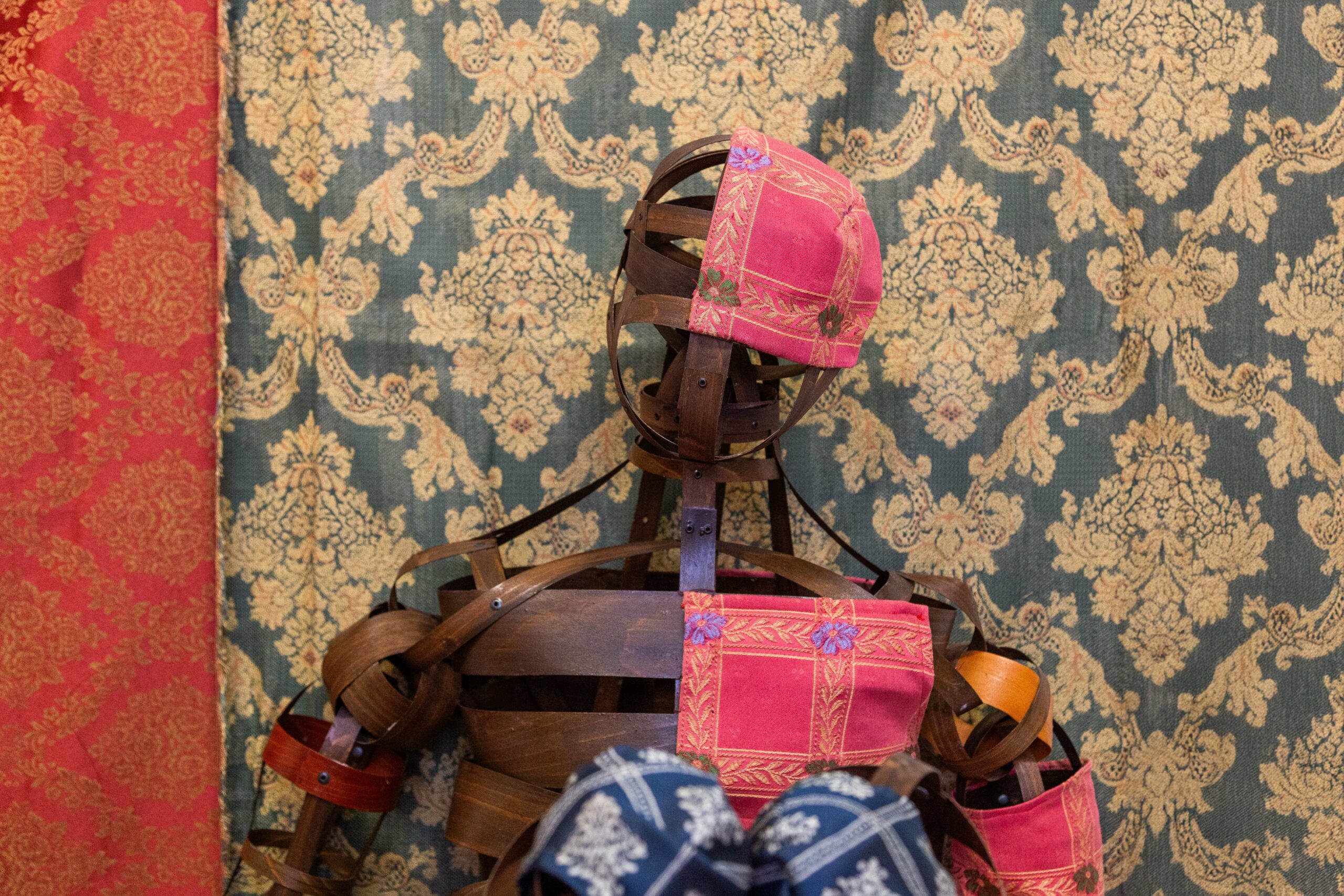 Entirely handcrafted, sewn, and assembled, these sculptures are partially covered with decorative motifs inspired by each of these locations. They evoke bodies at rest congured in ambiguous postures: somewhere between searching, meditating, and praying.