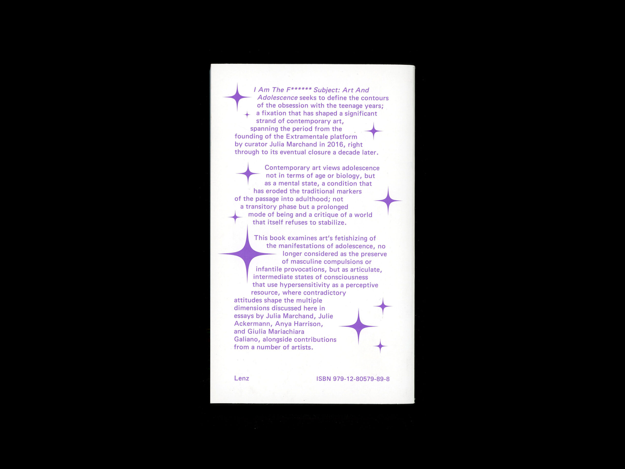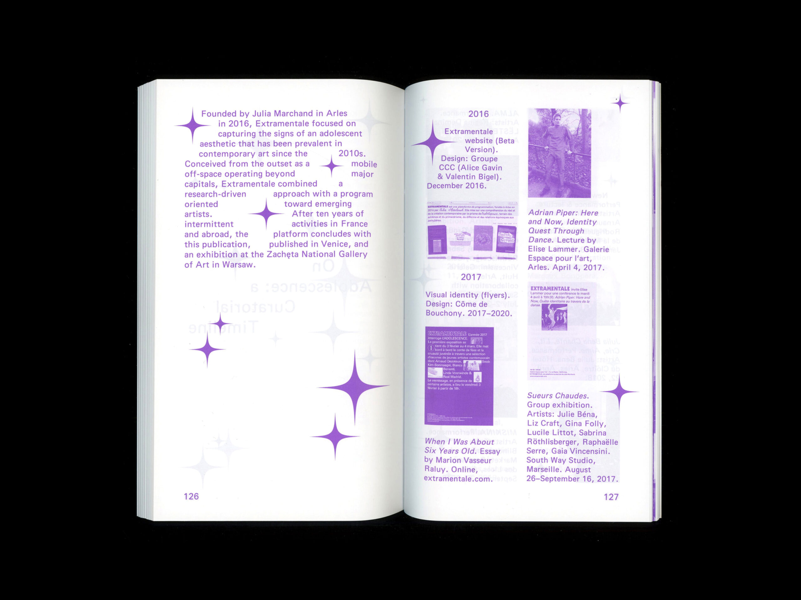 Edited by Julia Marchand, founder of Extramentale, a curatorial platform devoted to teenage aesthetics. This book spans the period of its activity from 2016—the date of its creation—to 2026, its closure. It gives voices to artists-adolescents and authors-adolescents, mainly millennials and Gen Zers.