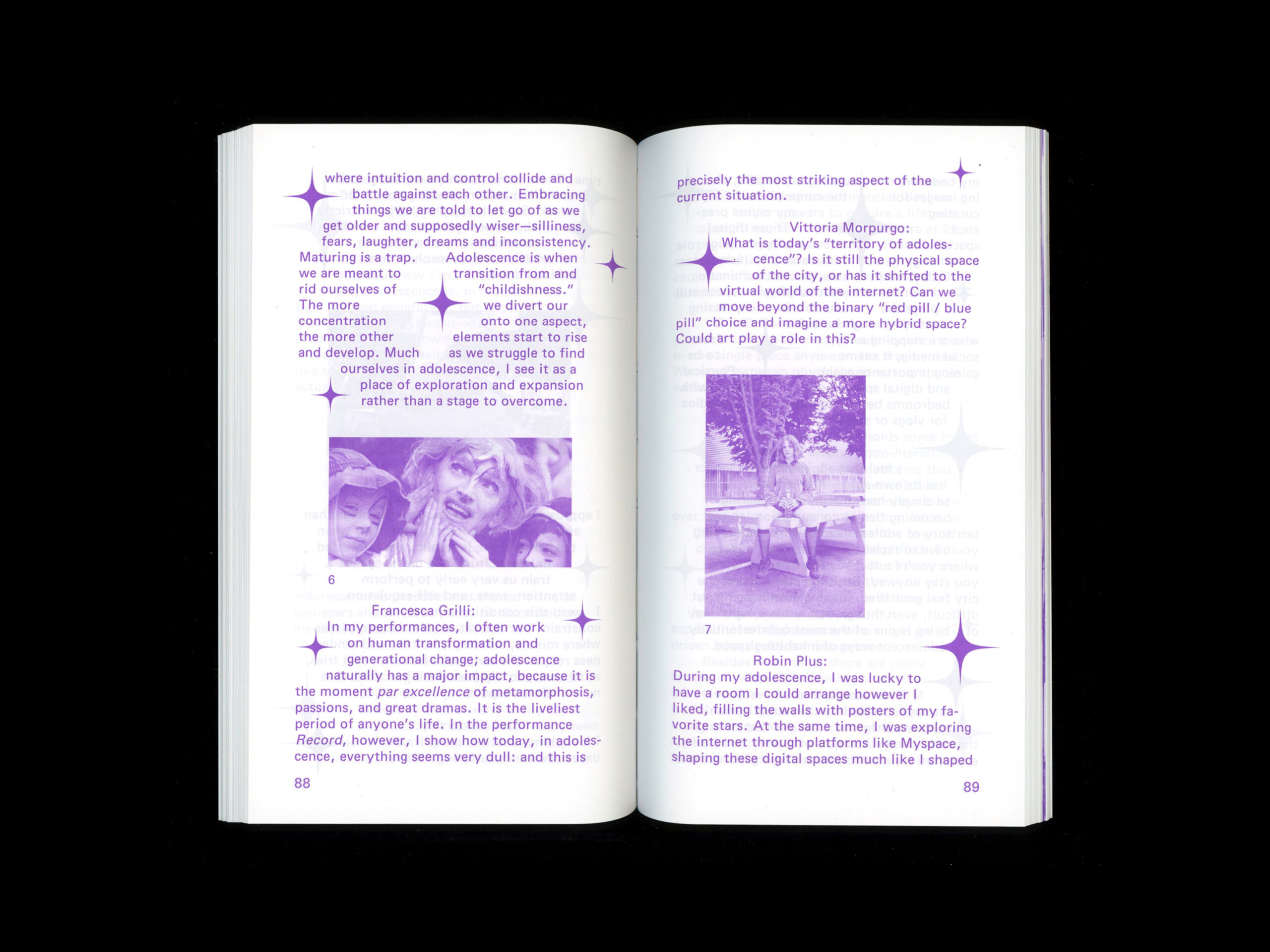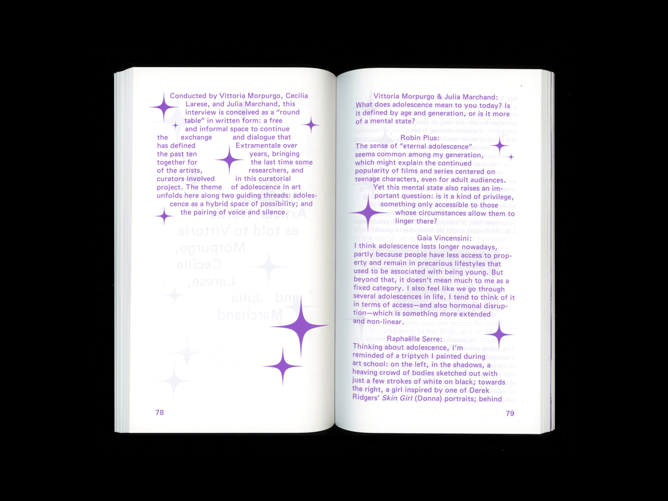 Adolescent artists of the Extramentale program and beyond contributed to this publication by sharing their words on the many dimensions of the adolescence: Robin Plus, Gaia Vincensini, Raphaëlle Serre, Linda Voorwinde, Tohé Commaret, Louise Nicolas de Lamballerie, Caroline Poggi, Jonathan Vinel, Kevin Blinderman, Mohamed Bourouissa, Michal Novotný, Laura Owens, Magda Szpecht, Thomas Liu Le Lann, Velvet Aubry, Arnaud Dezoteux, Prune Phi, Alban Diaz, Ant Łakomsk, Liselor Perez, Francesca Grilli, Camille Aleña, Joanna Kordjak, and Katarzyna Kołodziej-Podsiadło; interviewed by Venice-based researchers Cecilia Larese, Vittoria Morpurgo, and Julia Marchand.